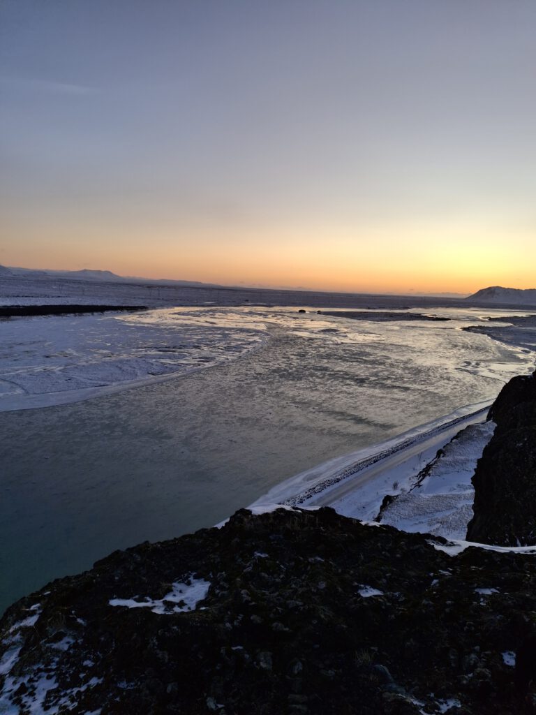 Am nächsten Morgen sind wir dann noch vor Sonnenaufgang losgefahren und haben uns zu unserem ersten Stopp dem Diamond Beach aufgemacht. Neben klaren Eisbrocken uns schwarzem Sand haben wir sogar zwei Robben gesichtet. Als nächstes sind wir zum Skaftafelljökull gefahren, wo man sehr nah an den Fuß des Gletschers laufen kann. Unser nächster Stopp war der Canyon Fjaðrárgljúfur, dort hat uns dann ein erster Hagelschauer erwischt. Dann haben wir noch kurz beim Lavafeld Eldhraun angehalten und sind dann weiter nach Skóga gefahren. Weil sie da in der Nähe gewohnt hat, hat sie mir ein bisschen den Wald dort und auch den Kvernufoss gezeigt. Weil es so windig war, sind wir am Wasserfall beide richtig nass geworden. Wir haben uns dann in einem Café eine Kleinigkeit zu essen geholt. Wir haben dann noch einen kurzen Stopp an ein der Höhle Rútshellir gemacht. Danach sind wir dann nach Hvolsvöllur gefahren uns haben dort nochmal was gegessen. Dann kam der Wetter Umschwung und es hat geschneit. Wir haben uns dann noch ein Eis geholt und uns auf den Weg zurück nach Hella gemacht. Die Abfahrtszeit für ihren Bus nach Selfoss war noch eine halbe Stunde entfernt und statt im Schnee zu warten habe ich sie dann noch die halbe Stunde nach Selfoss gefahren. Die Kombination aus Schnee, Wind und der Dämmerung war zwar nicht mehr wirklich angenehm zu fahren, aber die Strecke nach Selfoss kenne ich zum Glück mittlerweile auswendig. Auf der Rückfahrt aus Selfoss habe ich dann gelernt, das es am nervigsten ist, wenn einem der Schnee vom Wind hinterher gepustet wir, weil man dann wirklich wenig sieht und es auch einfach nicht besser wird. Kommt der Wind queer zur Fahrtrichtung, sieht es zwar vielleicht zwischendurch so aus, als führe man auf eine weiße Wand zu, aber man findet immer wieder Löcher und der Scheibenwischer hilf auch. Kommt der Schnee von vorne, ist der Scheibenwischer dein bester Freund. Aber von hinten hilf es alles nichts. Ich war jedenfalls froh, als ich nach diesem großen Abenteuer wieder zurück war. Doch es ging Schlag auf Schlag weiter, denn am Montag war dann Rosenmontag oder wie er hier heißt Bollurdagur. Davon dann aber mehr im März.